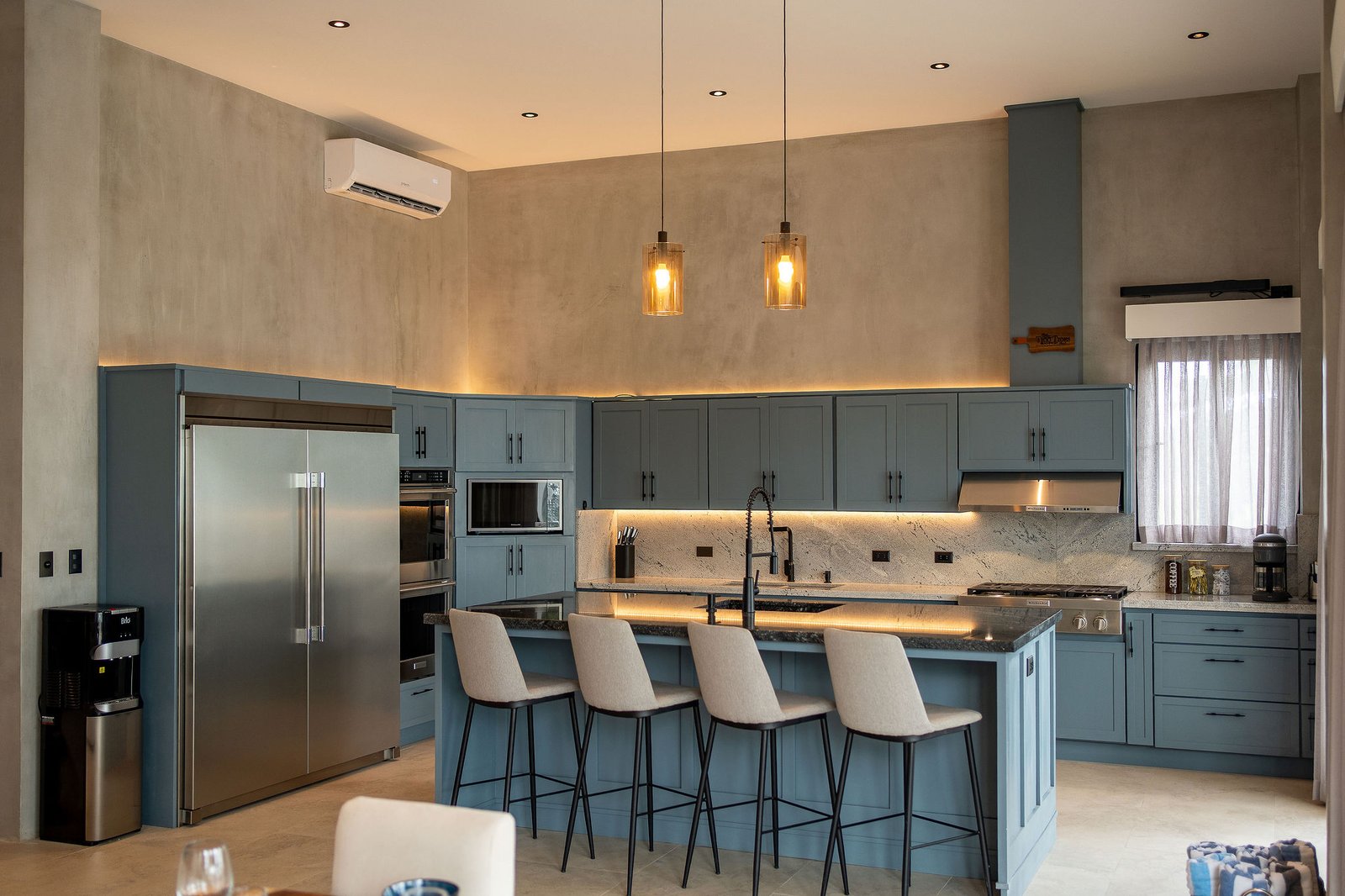 The entertainer’s dream kitchen includes a large eat-in island with seating for large groups, a full bar, and high-end appliances—perfect for hosting unforgettable gatherings.