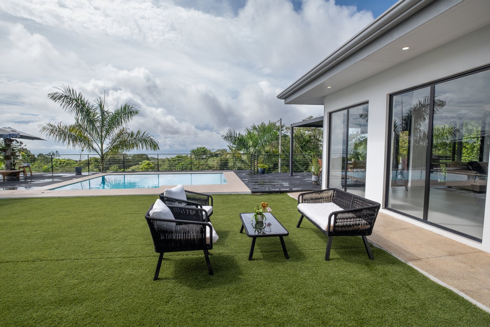 Outdoor living is equally impressive. A private swimming pool overlooks the surrounding landscape and distant ocean, providing the perfect space for relaxation or entertaining. The generous land size includes multiple building sites, offering room to expand with guest homes, additional structures, or future development.
