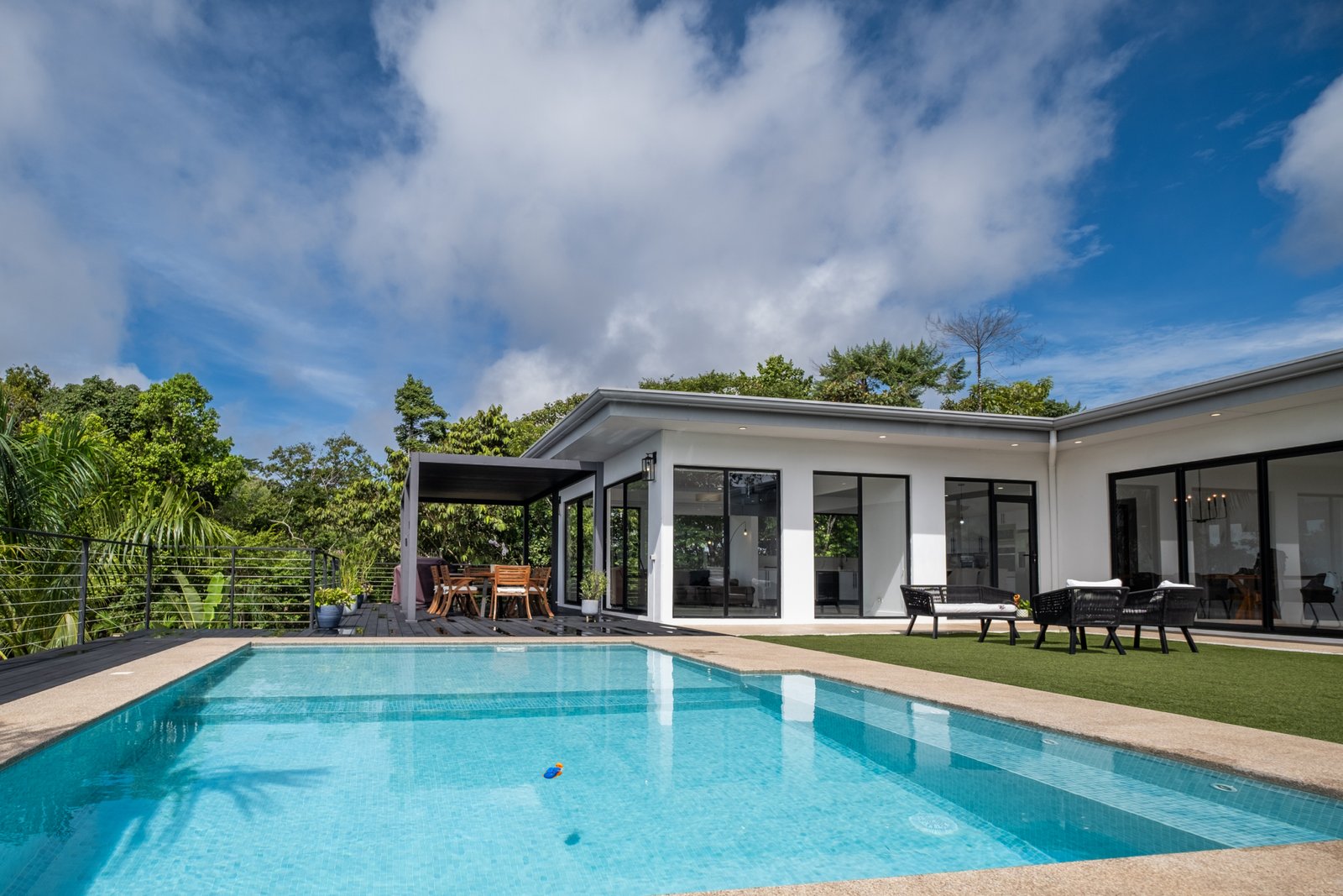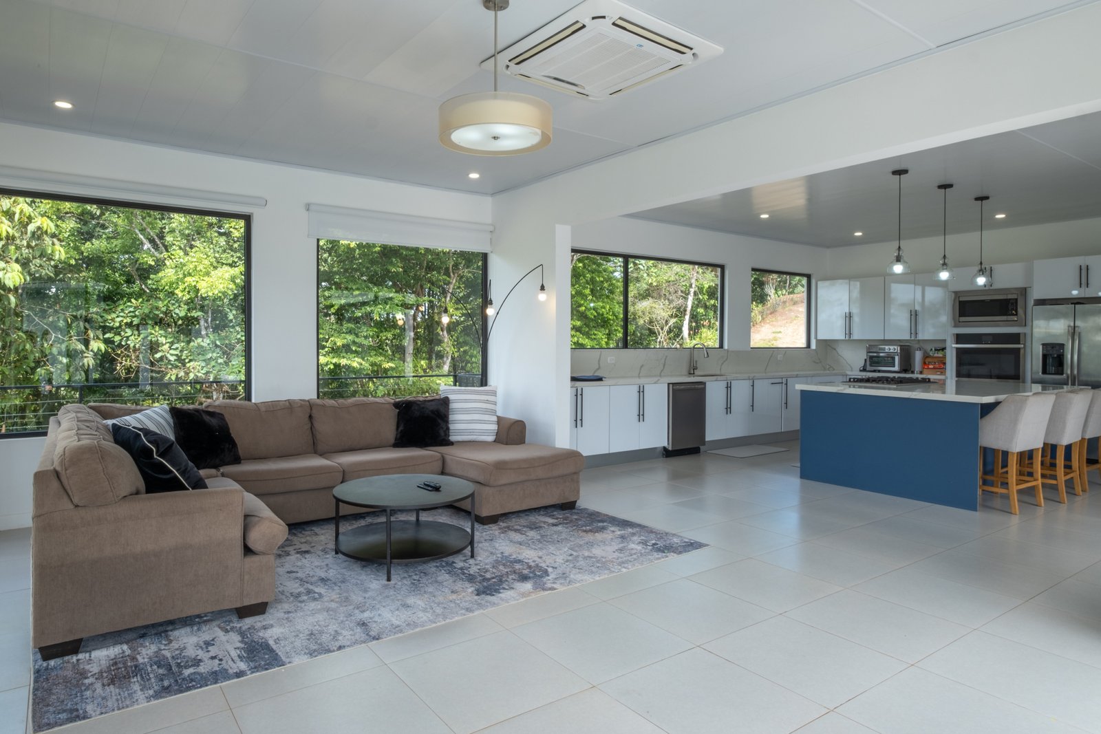 The home offers 4 spacious bedrooms and 3 bathrooms, highlighted by soaring high ceilings and an open-concept layout that fills the interior with natural light. Clean architectural lines and a contemporary design create a refined yet comfortable living environment.