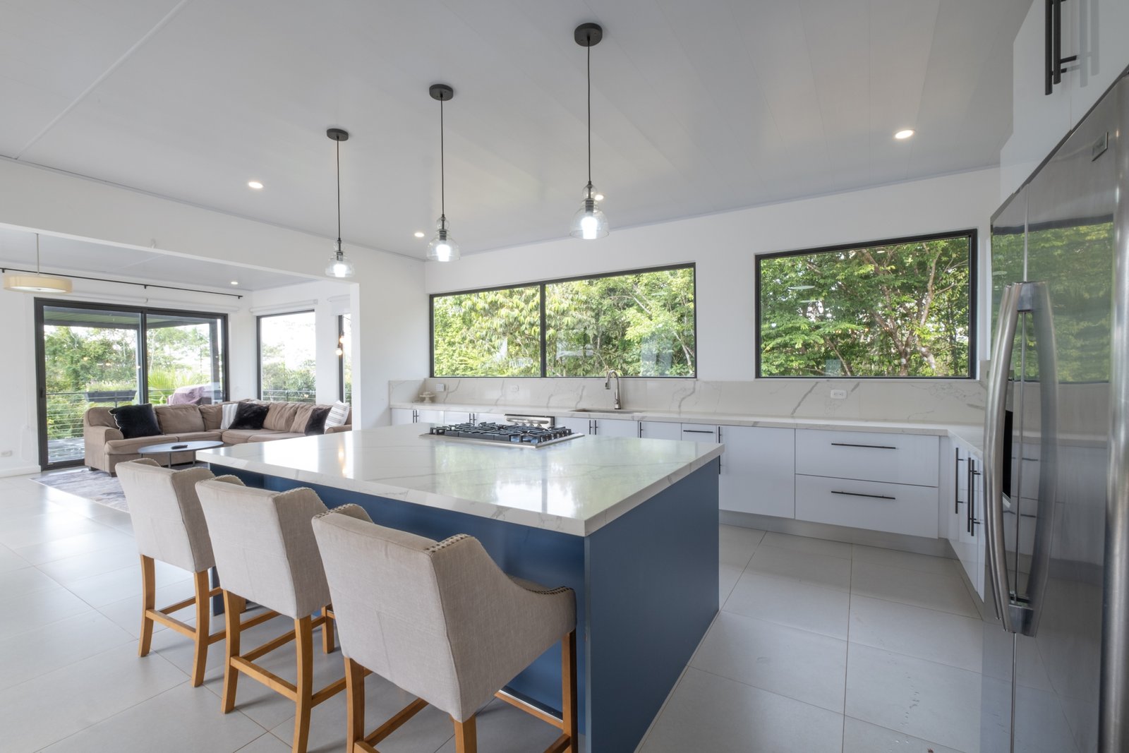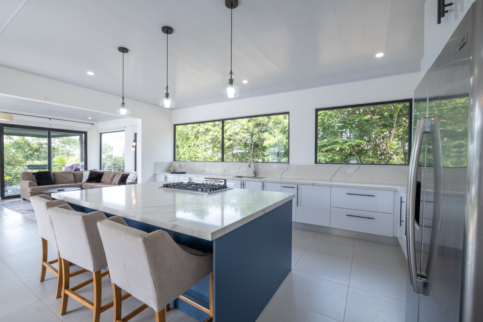 The home features 4 spacious bedrooms and 3 bathrooms, with soaring high ceilings and an open-concept layout that enhances natural light and airflow throughout. The modern contemporary design blends clean architectural lines with warm finishes, creating a comfortable yet sophisticated atmosphere.